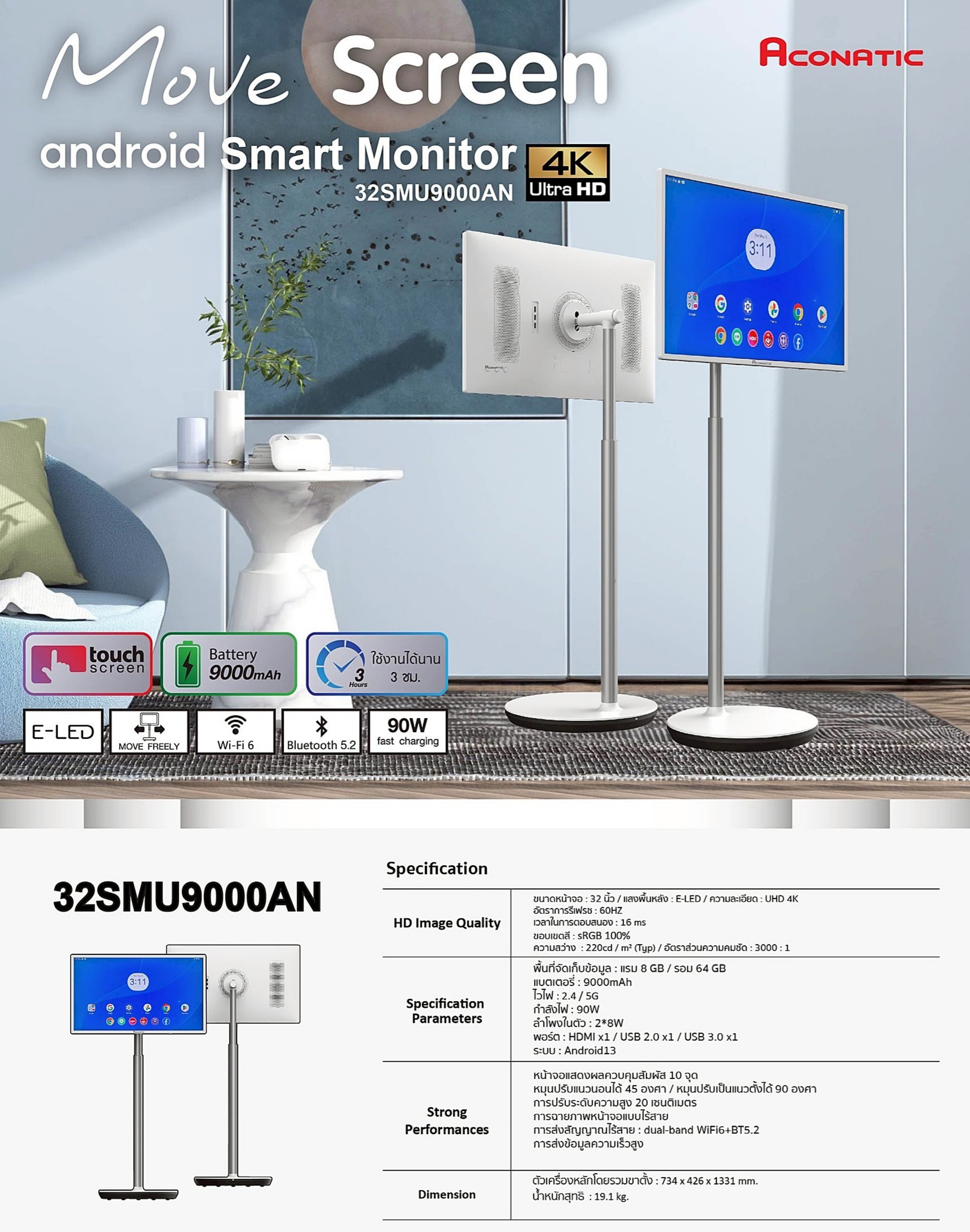 ดื่มด่ำกับทุกความบันเทิง ทุกการทำงาน แบบเต็มตา !! ไปกับจอมอนิเตอร์ ACONATIC 32 นิ้ว รุ่น 32SMU9000AN ที่ให้ภาพคมชัดระดับ 4K Ultra HD บนจอโค้งมนดีไซน์สวย จะใช้งานที่ไหนก็ง่าย เพราะมีล้อเลื่อนและแบตเตอรี่ในตัวความจุ 9,000 mAh ใช้งานต่อเนื่องได้หลายชั่วโมง พร้อมระบบสัมผัส 10 จุด บนหน้าจอตอบสนองฉับไว สามารถหมุน-ปรับ-ตั้ง ตัวจอได้ง่ายดาย ทำงานด้วยระบบปฏิบัติการ Android 13 พร้อมหน่วยความจำ 8 GB และยังเชื่อมต่อไร้สายด้วย Wi-Fi และ Bluetooth ที่ให้สัญญาณแรงเสถียรไม่มีสะดุด มอบประสบการณ์ที่เหนือกว่าด้วยลำโพงสเตอริโอในตัว 2x8W ที่ให้เสียงคมชัด และพอร์ตเชื่อมต่อที่ได้มาตรฐาน ไม่ว่าจะ HDMI หรือ USB ทั้งหมดนี้จะทำให้ทุกช่วงเวลาของคุณสมบูรณ์แบบกว่าที่เคย