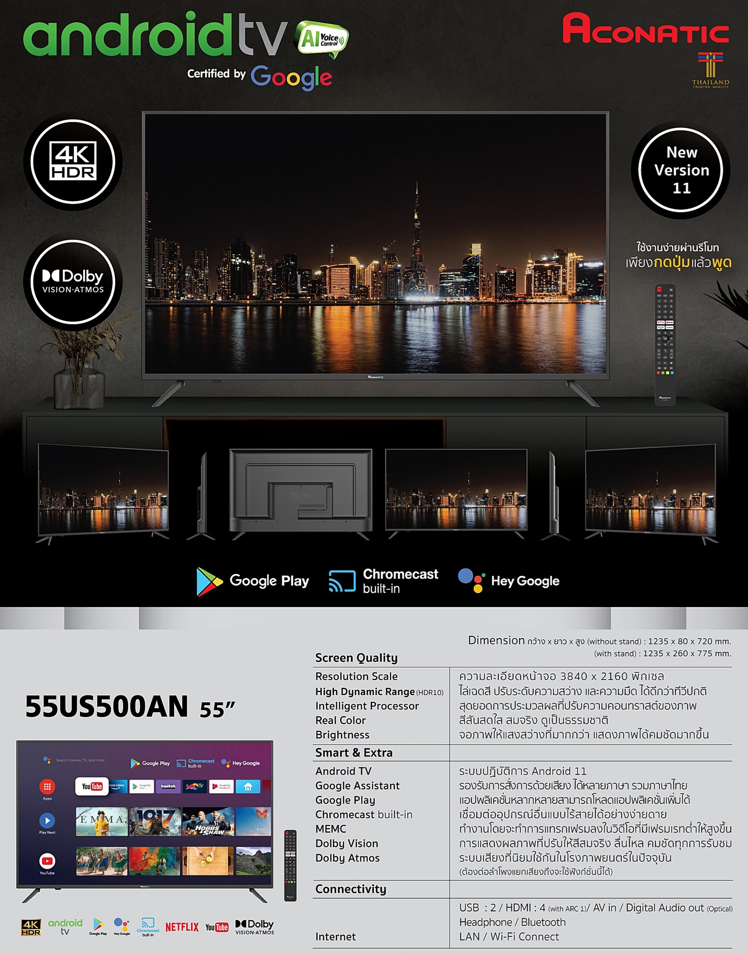 LED แอนดรอยด์ทีวี ขนาด 55 นิ้ว 4K Aconatic 55US500AN